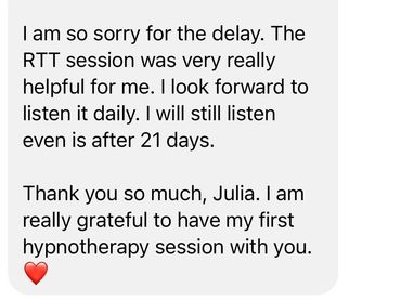 Julia helped me overcome my issue and so much more. During the session, emotions, thoughts and feelings arose, I spoke about things that I never thought were holding me back. One thing I really liked was that Julia led me from one step to another when I felt I couldn't see or feel anything at a particular moment. I found this experience so amazing! I just spoke out without any hesitation and revealed the true feelings and thoughts that have been buried deep inside me for years. It was such a relief.