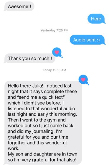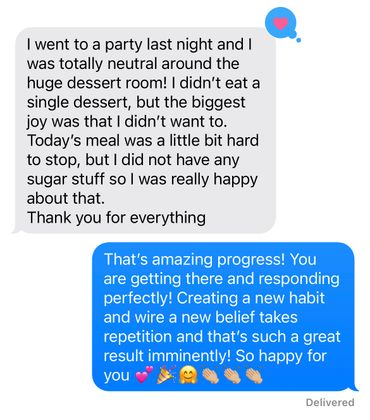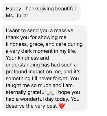 I had an amazing & life-changing session with Julia. I came to her because I’ve struggled with a little (but bad) addiction to sweets/carbs almost my entire life. Julia helped me see why and how this addiction became an addiction in the first place. I now understand that what I had was an “emotional belief” about sweets that are no longer serving me. It just all makes so much sense now... Wow, such a great “aha” moment! I was very impressed with Julia's professionalism and I can clearly see how much she cares about helping people heal. I highly recommend working with her. You won't regret it. Thank you, Julia.