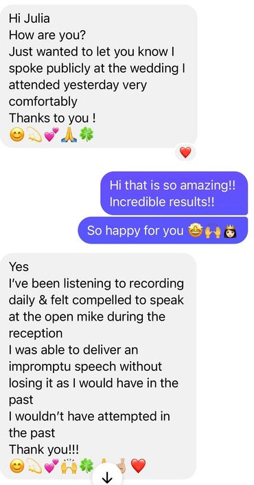 A couple of weeks after the session, I've spoke publicly at a wedding I attended. This was my brother's widow getting married so it was very emotional tribute to my brother while wishing them the best. People actually congratulated me for speaking. I really don't think I would have had the nerve to go up before and then would've been upset that I didn't.