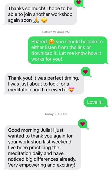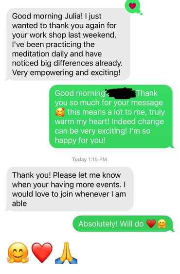 Julia's energy is sweet and attentive. It feels that she really cares and wants to genuinely help. Her voice is calming and she has a brilliant way of knowing exactly what to ask and how to guide her sessions. After my session, I felt super relaxed and grateful for the deep sense of clarity regarding the root cause of my issue. I highly recommend working with Julia on any issue you have!